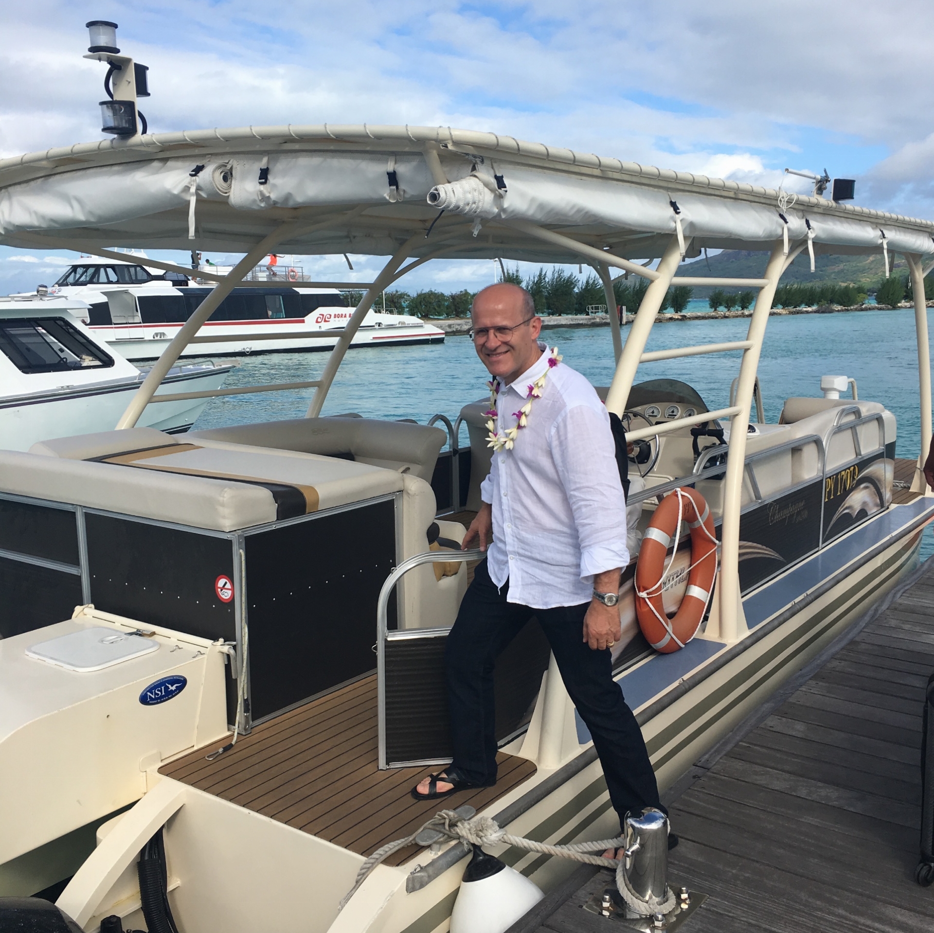 O voo de Papeete é num avião menor, para mais ou menos 100 pessoas, um voo tranquilo de 50 minutos. Ao avistar a ilha, os diferentes tons de azul chamam a atenção pela beleza. Do aeroporto até o hotel, fomos com uma aqua taxi, outra experiência diferente. Aliás, (e importante!) é preciso agendar este transporte, e é bom fazê-lo antes, até pela questão dos valores, é como um transfer e não está incluso na diária.