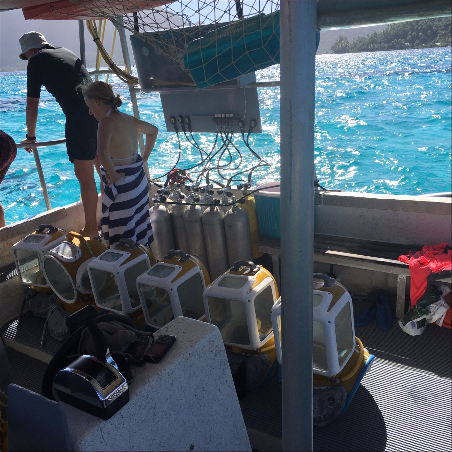 Em um dos dias, escolhemos fazer algo diferente, um Aqua Safari. Com agendamento, a lancha veio nos buscar no píer do hotel às 8h30. Junto conosco, foram dois casais, um iraniano e outro nova iorquino. Navegamos por volta de 20 minutos até um local onde outra lancha nos esperava. Lá, o capitão veio a bordo e explicou como iria funcionar. É simples, parece um pouco assustador no começo, mas vale muito a pena. Você desce a escada da lancha, e quando a água está na altura do seu ombro, eles colocam o escafandro na sua cabeça e você começa a emergir na água. Em baixo da água, existem cordas para se segurar. Dá um pouco de medo no começo, mas a beleza e os peixes que se aproximam fazem com que você se esqueça de tudo. Os peixes literalmente esbarram em você e é possível até tocá-los. São 3 metros abaixo do nível da água e 30 minutos inesquecíveis! Fiquei realmente estupefata. Quando veio a arraia, foi incrível, pois o instrutor a trouxe pra perto de nós para tocá-la. Ela têm uma textura macia e firme, muito diferente. Foi uma experiência única!
