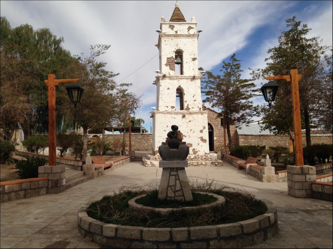 A Laguna Miscanti é fabulosa, no pico do inverno (viajamos em julho) ela congela, sendo possível andar por ela de ponta a ponta, sempre com cuidado, é claro. Essa região fica a uns 100 km de San Pedro, e na volta paramos em algumas cidadezinhas e lugares históricos, como a cidade de Toconao, que se resume basicamente a algumas quadras de casas em volta desta praça: