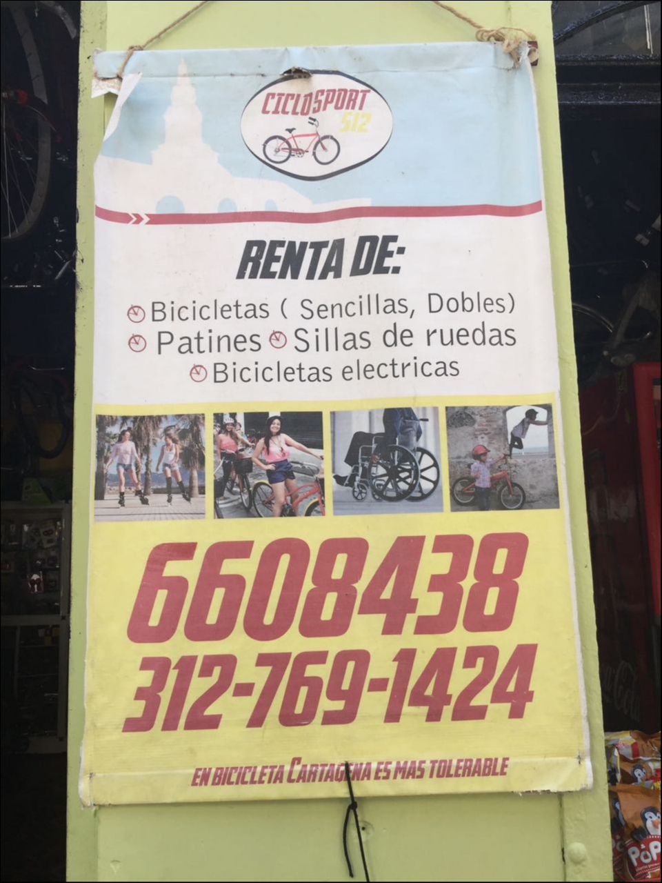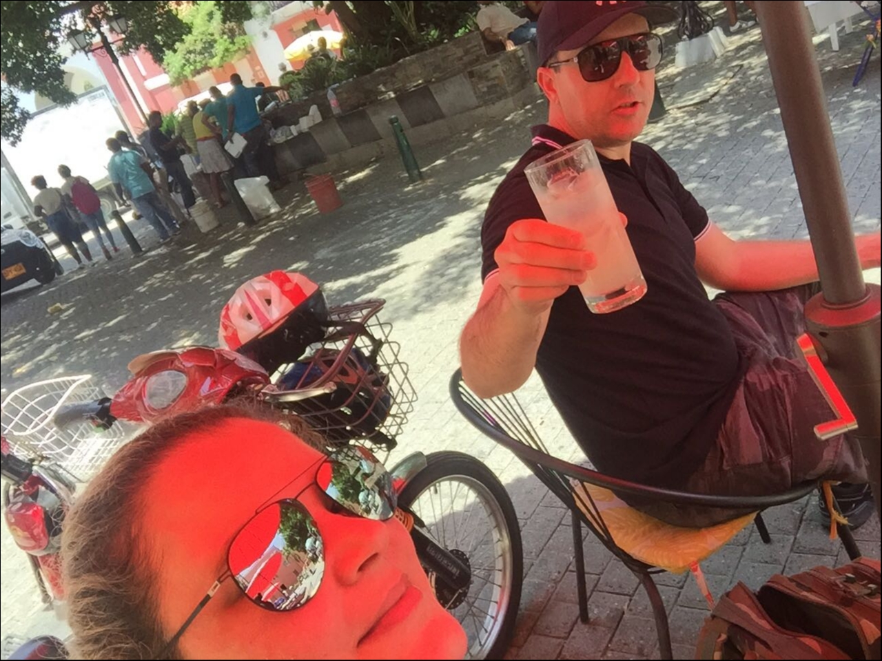 Ruelas de CartagenaApesar das ruas com aspectos antigos, há várias lojas de grifesEsta foi a companhia que alugamos as motos elétricasMeu marido e eu (Ethel) fazendo uma parada para um refresco!