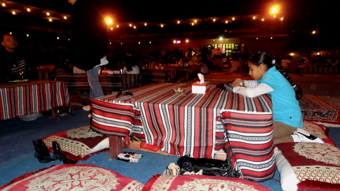 O momento do jantar é bastante miscigenado, já que sob a gigante tenda e na mesma mesa se sentam pessoas de todas as idades, nacionalidades e culturas... As pessoas se acomodam sentadas no chão, em cima de almofadas, sendo que há aqueles que se alimentam utilizando garfo e faca e outros com a mão.