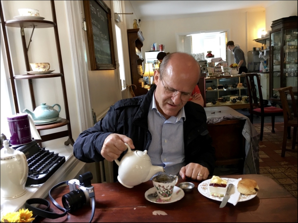 No caminho, paramos numa casa de chá muito charmosa que tinha até scone (O scone é tipo um pão de origem escocesa e muito popular no Reino Unido, Estados Unidos, Canadá, Austrália, Nova Zelândia e Irlanda. O que faz o sconeser diferente de um pão simples é que a manteiga que é adicionada deve ficar em pequenos pedaços, dando uma textura toda especial) sem glúten e sem lactose, uma delícia!