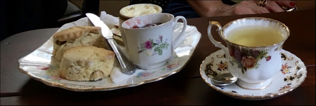 No caminho, paramos numa casa de chá muito charmosa que tinha até scone (O scone é tipo um pão de origem escocesa e muito popular no Reino Unido, Estados Unidos, Canadá, Austrália, Nova Zelândia e Irlanda. O que faz o sconeser diferente de um pão simples é que a manteiga que é adicionada deve ficar em pequenos pedaços, dando uma textura toda especial) sem glúten e sem lactose, uma delícia!