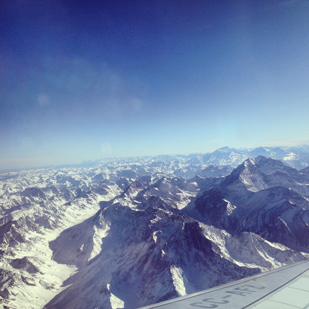 Durante o voo para o Chile, faltando cerca de uma hora para o pouso em Santiago, passamos por cima da Cordilheira dos Andes (o legal é que todo mundo no Chile fala da Cordilheira com um orgulho e admiração, eles realmente sabem a história e geografia das montanhas).