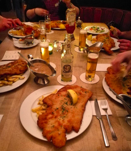 -Schnitzel / Bife à milanesa: geralmente é feito de carne de porco ou vitela, tende a ficar bem fininho e crocante, mas também úmido e suculento por dentro da casquinha de pão que empana a carne.