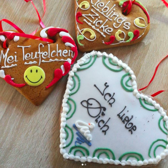 - Lebkuchen: é uma espécie de biscoito doce/pão de mel fino, é muito conhecido em diversas cidades da Alemanha. Feito de farinha, ovos, açúcar, mel, especiarias (como canela, anis, cardamomo, gengibre), nozes e frutas cristalizadas. É bem famoso em diversos países europeus, mas em especial na Alemanha. O formato em coração aliás, é um dos mais famosos de se ver nas feiras de rua alemãs, com declarações de amor, frases divertidas, nomes de cidades, etc.