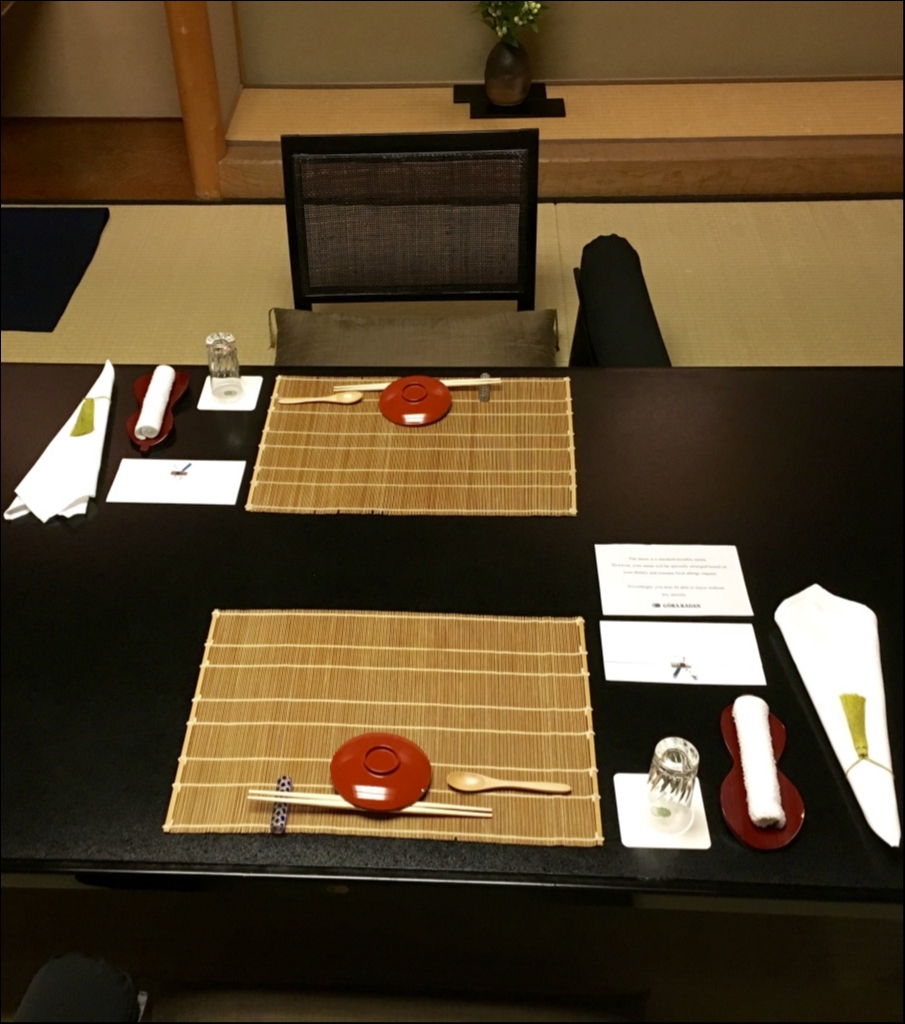 Quando chegamos no quarto, fomos apresentados pelo nosso mordomo, que "cuidou" de nós durante a estadia no hotel. A primeira coisa que ele nos explicou foi como usar os quimonos para o jantar que seria servido no quarto mesmo. O Jantar teve oito pratos diferentes e nos surpreendeu como culinária e também como layout diferenciado, tudo com muito capricho. O Cafe da manhã também foi surpreendente.